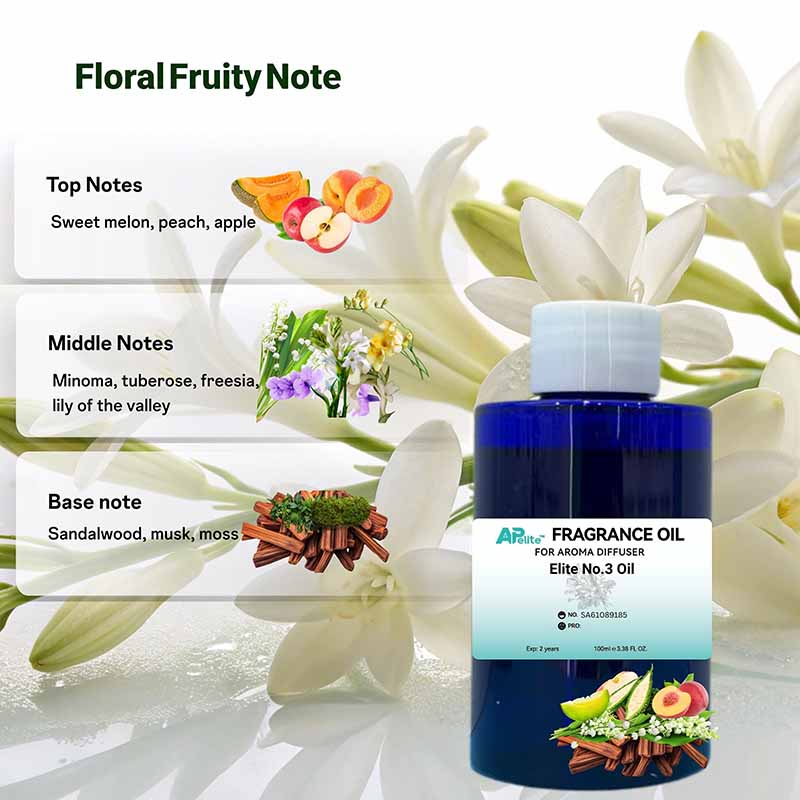 Experience luxury with Apelite Elite No.3 Fragrance Oil. This 100ml diffuser oil delivers a captivating floral fruity scent, blending sweet melon, crisp apple, delicate tuberose, and warm sandalwood. Perfect for aromatherapy, it creates a refreshing yet elegant ambiance in any room.