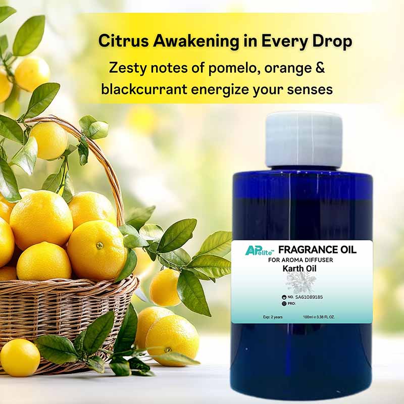 Elevate your space with Apelite Karth Fragrance Oil, a crisp citrus blend designed for diffusers. This 100ml aromatherapy oil features a vibrant fusion of pomelo, orange, jasmine, and honey, creating an energizing yet soothing home fragrance perfect for daily use.