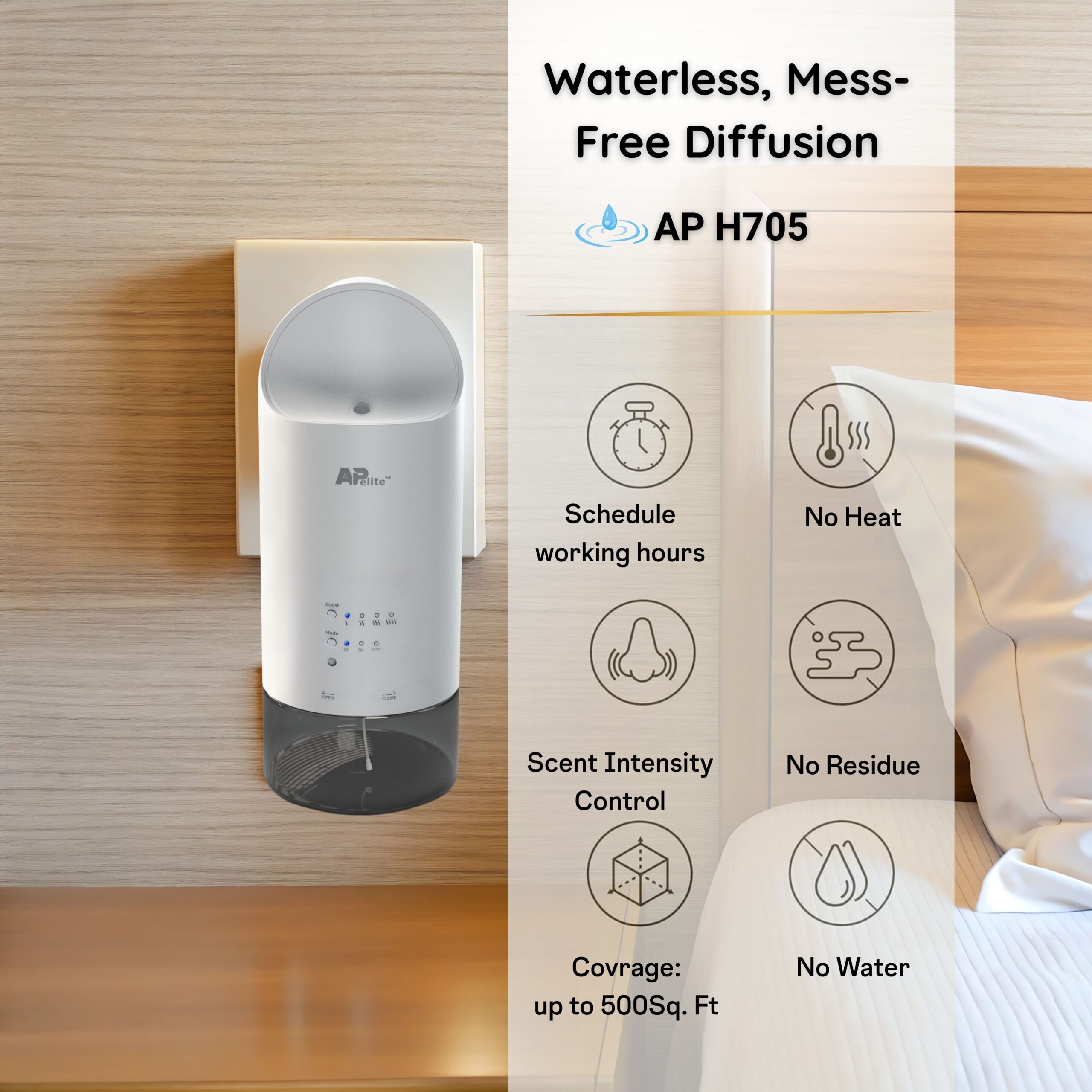 Say goodbye to candles, wax melts, and plug-ins. The AP H705 offers a safer, longer-lasting alternative with no heat or residue—perfect for creating a luxurious, hotel-like atmosphere in any room.
